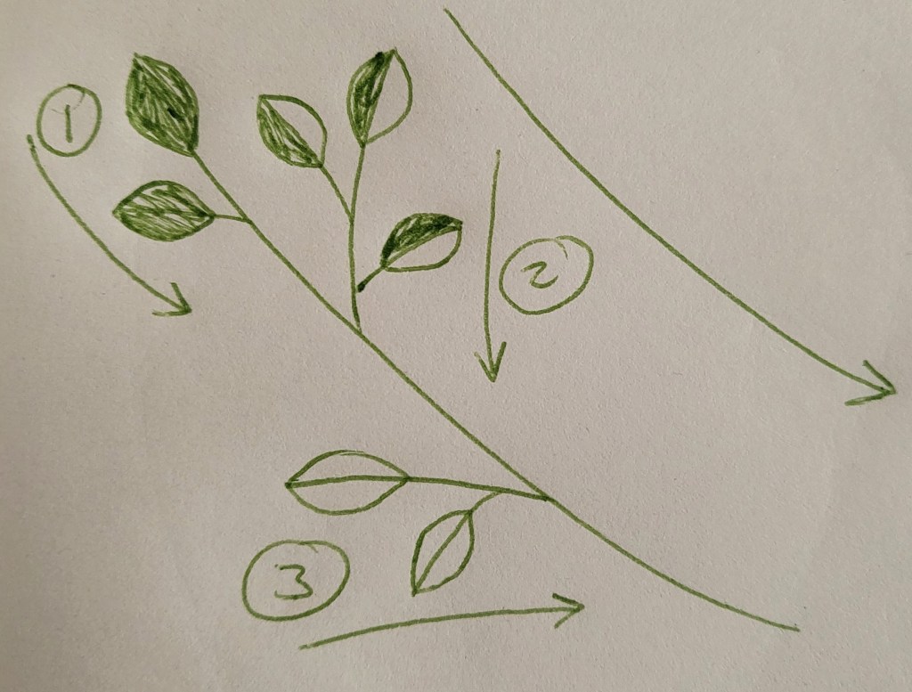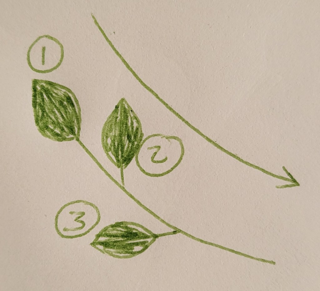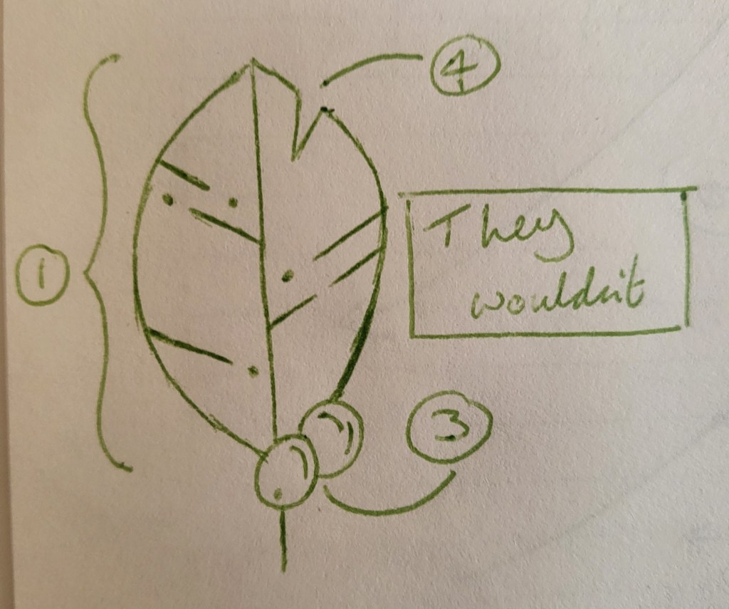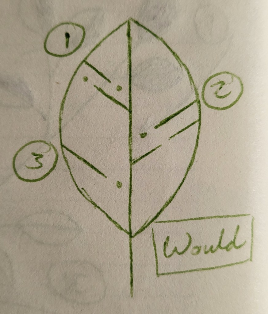 Lastly, you add any other additional modifications. In this example, we are using the negative. This is represented by a triangular notch in the top right edge of the leaf. When comparing this back to our basic leaf structure, section [1(&2)] contains the base verb written out using the leaf lines, section [3] has both the tense of the verb and relevant pronouns to the phrase in the form of berries, and section [4] contains some other relevant information to the phrase using modifications to the base leaf/plant.