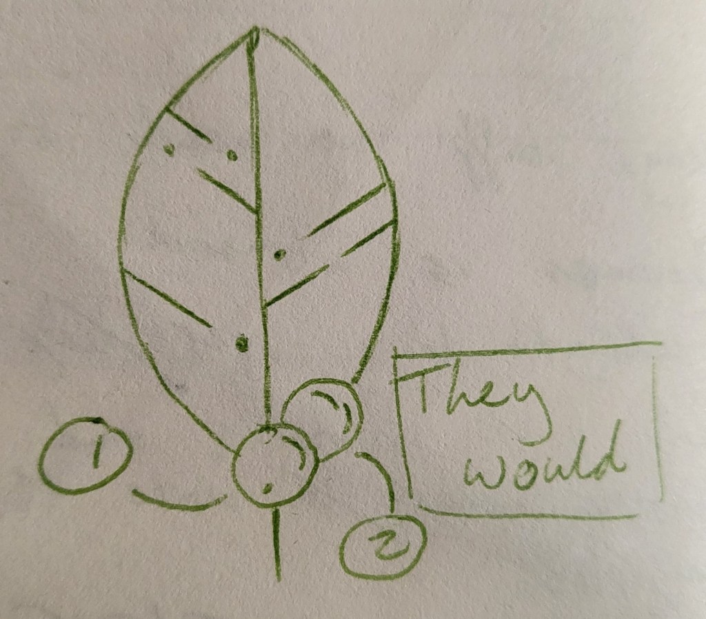 In some cases, you can use berries and other modifications to the plant to condense down phrases. The berries are used to denote tenses and pronouns and the plant modifications are used to denote various other things such as a gerund or whether something is possessive. To demonstrate this, let’s use the example ‘they wouldn’t’ again.