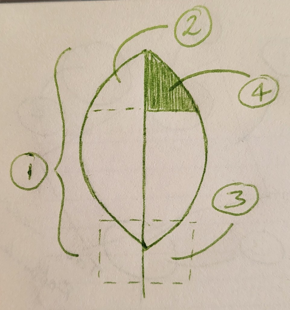The leaves themselves can be split up into a few different sections, as seen in this image. Section [1], the white part of the leaf, is where the leaf lines are placed, with section [2], the top left part of the leaf, being where the first leaf line of any given leaf goes. Section [3], the base of the leaf, is where the berries are placed. And section [4], the top right part of the leaf, is where all but 2 other modifications to the plant placed.