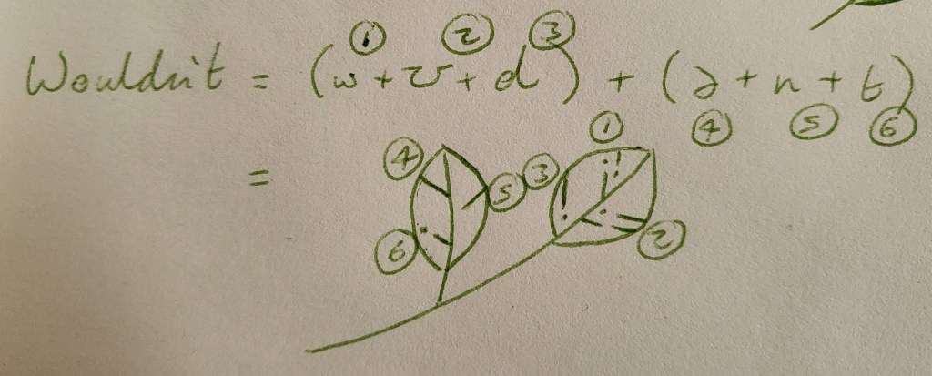 Another example that we can use is the word ‘wouldn’t’. The word ‘wouldn’t’ is 2 syllables and is therefore written across 2 leaves. Even though there is an apostrophe in the word, it is not included in the cipher as it doesn’t really change the sound of the word.