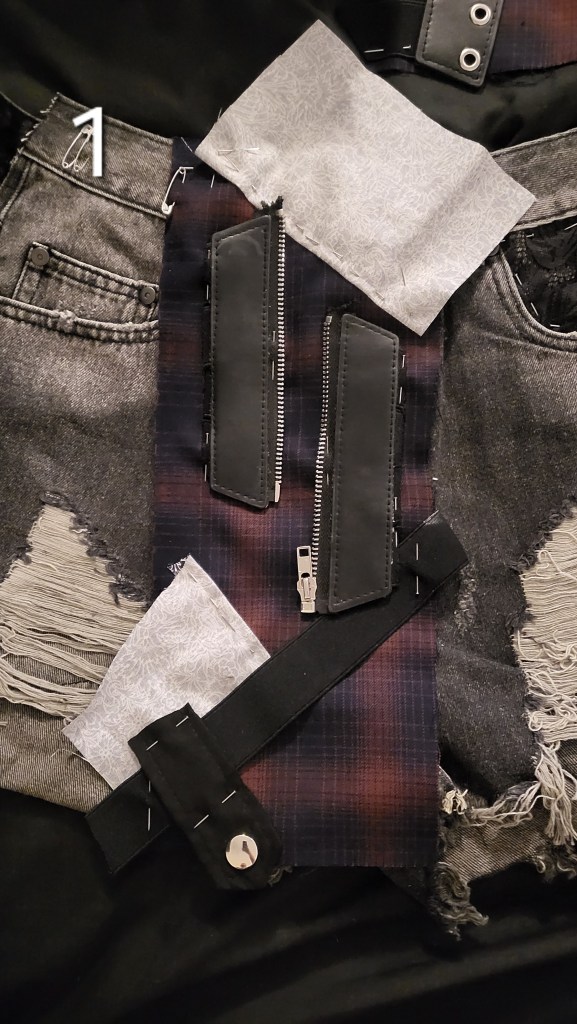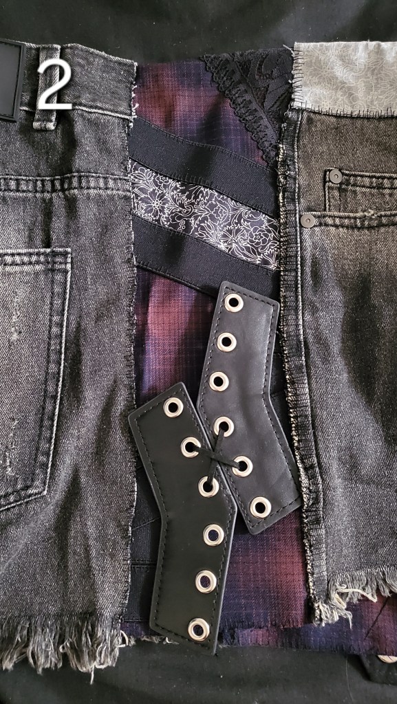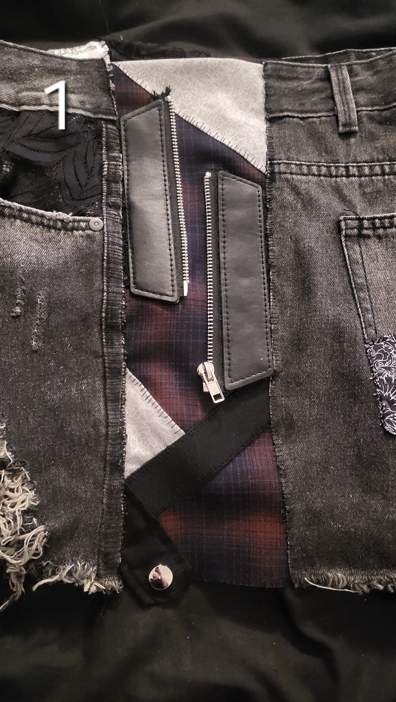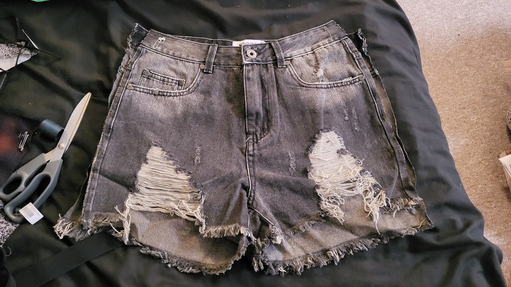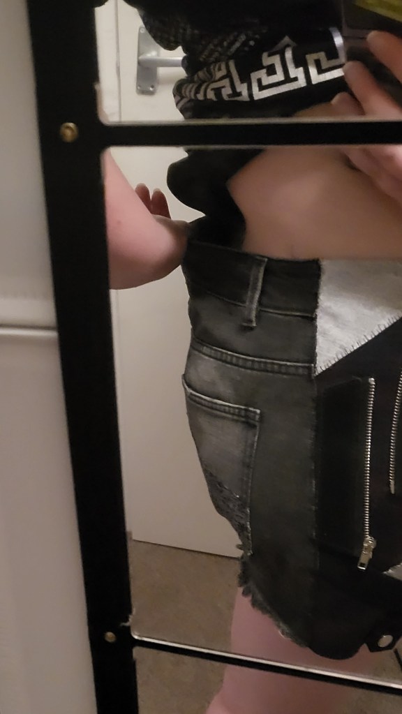 After that, I started working on the panels. I wanted to make them unique and interesting and to lean into the short’s already slightly tatty and alternative look. Basically, I wanted them to look kind of cobbled together; especially since I do not own a sewing machine, and knew that I was going to have to hand sew everything and it likely wouldn’t look the neatest.