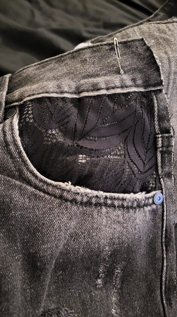 After pinning all the bits and bobs to the panels, I then proceeded to put off actually sewing them together. Instead, I started adding some extra details to the shorts themselves. The first thing that I actually sewed onto the short was some lace (again, from the bra that didn’t look nice on me) onto one of the pockets. I really liked the way it looked and it, weirdly, motivated me to keep going.