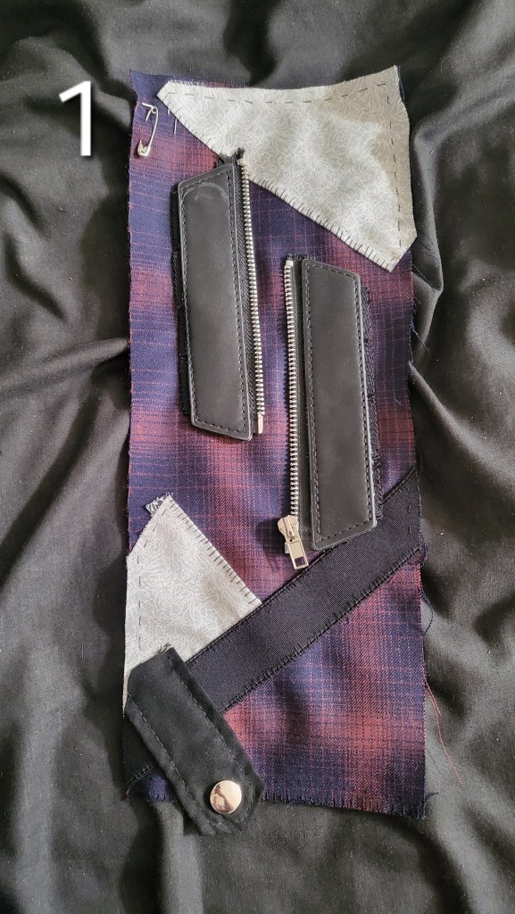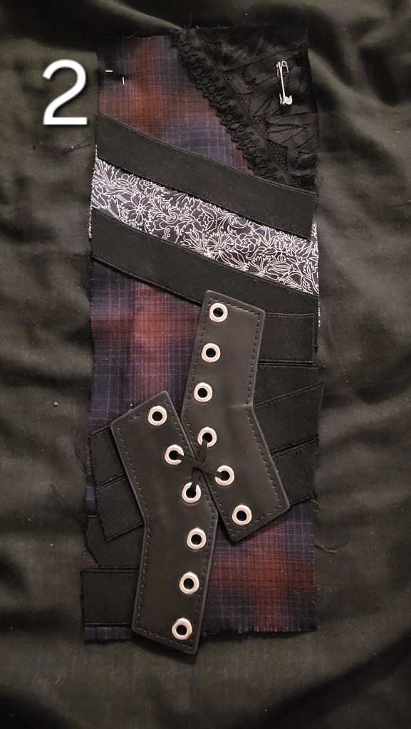 After that, it was time to start designing the panels. I didn’t really have much of a plan going in. The only thing that I knew that I wanted to add was the remnants of a belt that didn’t fit me (are you noticing a theme here?) and that had already harvested some elastic from in order to modify a top. I ended up using almost all of what remained of that belt, some other fabric that I had laying around (both the front and back sides of it), some lace from a bra that just didn’t look good on me (but did actually fit), and a small part of a cloak that was NOT as advertised.