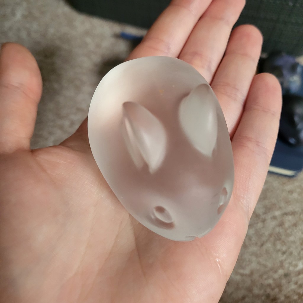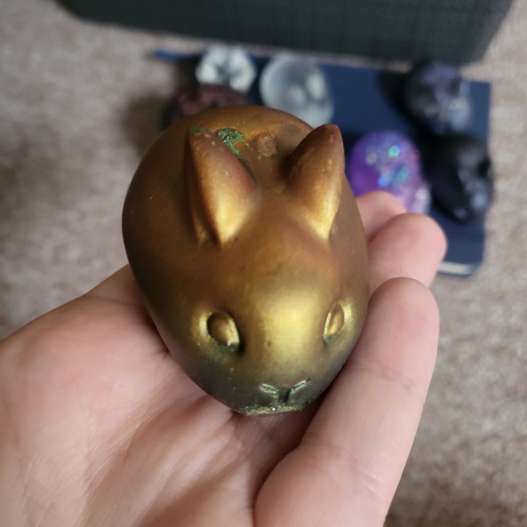 Although this bunny turned out really well, I’m not exactly sure why he ended up having a bit of a frosted look to him. All of the rabbits did, actually. I can only assume that it was due to the moulds, as I made a D20 with the leftover squishy resin and that turned out as clear expected. Bit weird, but he looks cute (so I don’t mind too much).