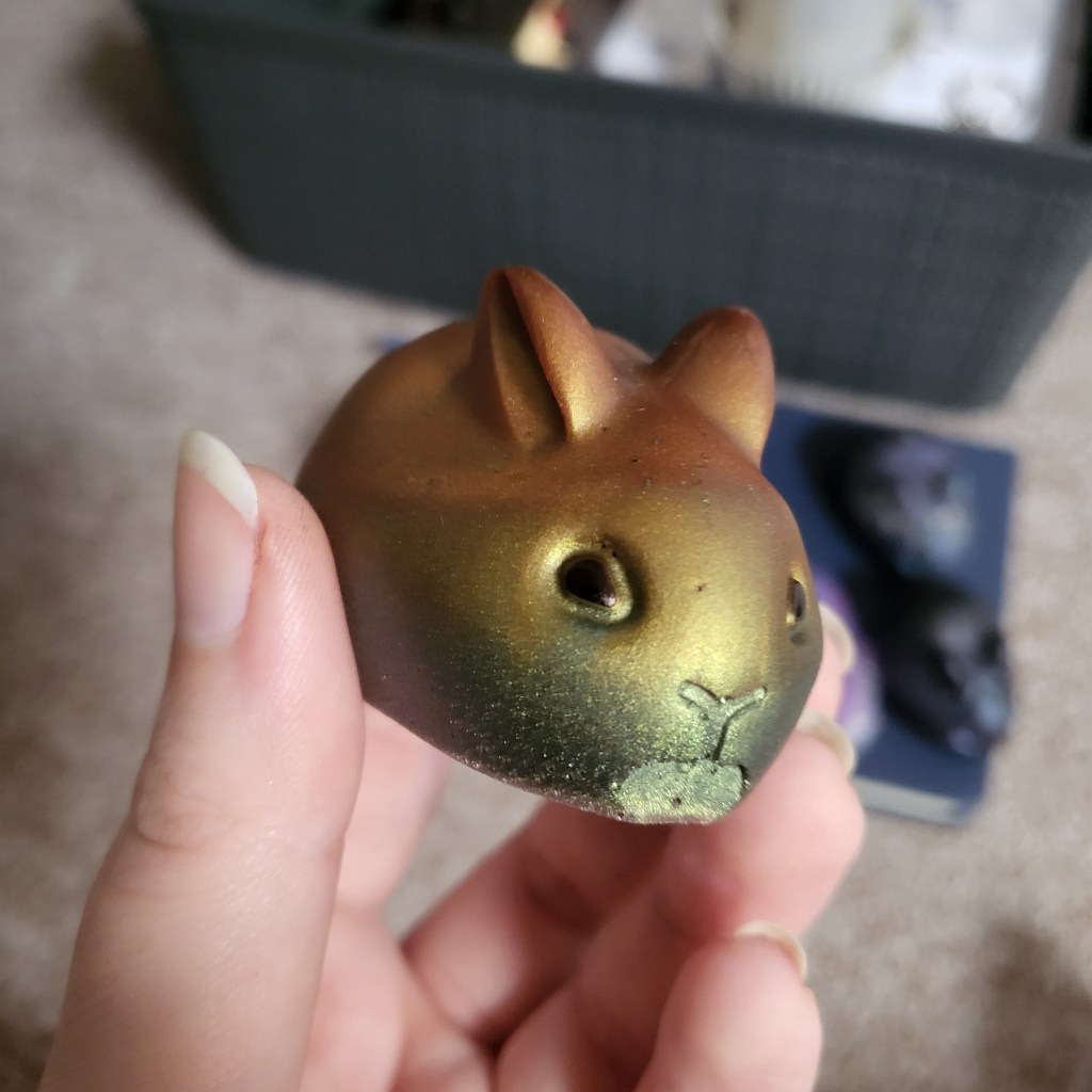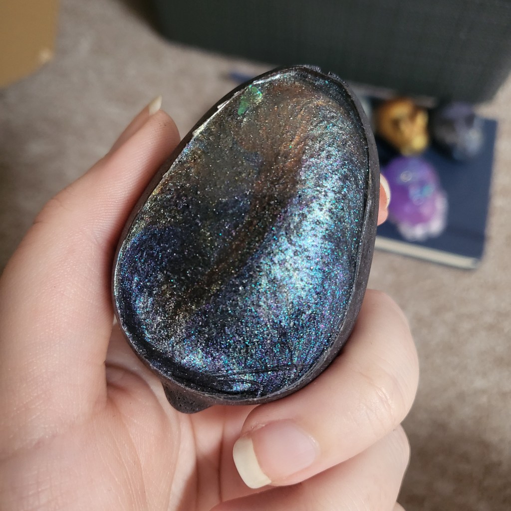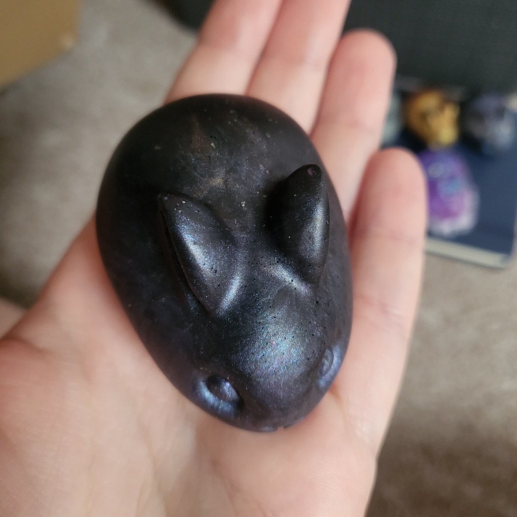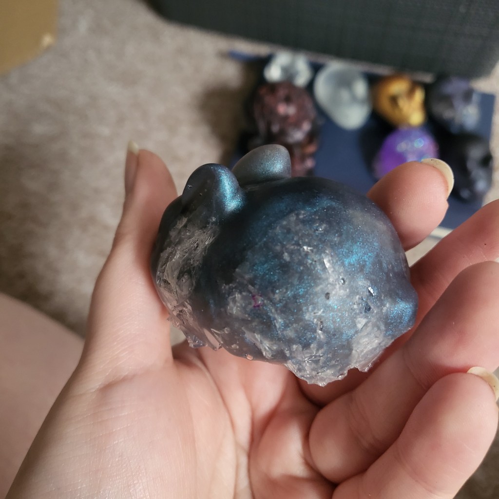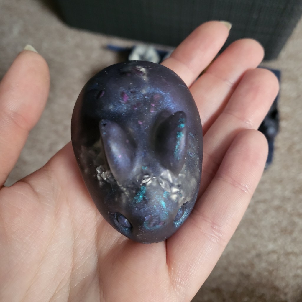 For this rabbit, I did a dirty pour with resin coloured with all 9 of my micas. It was supposed to be a beautiful mix of red, orange, gold, green, light blue, dark blue, light purple, dark purple, and black. I had hoped that they would come out looking like a swirling, sparkling oil slick. They instead ended up looking like your average night with light pollution. You can see, on the bunny’s underside, what I had hoped he would look like. Sadly, this was not the case.