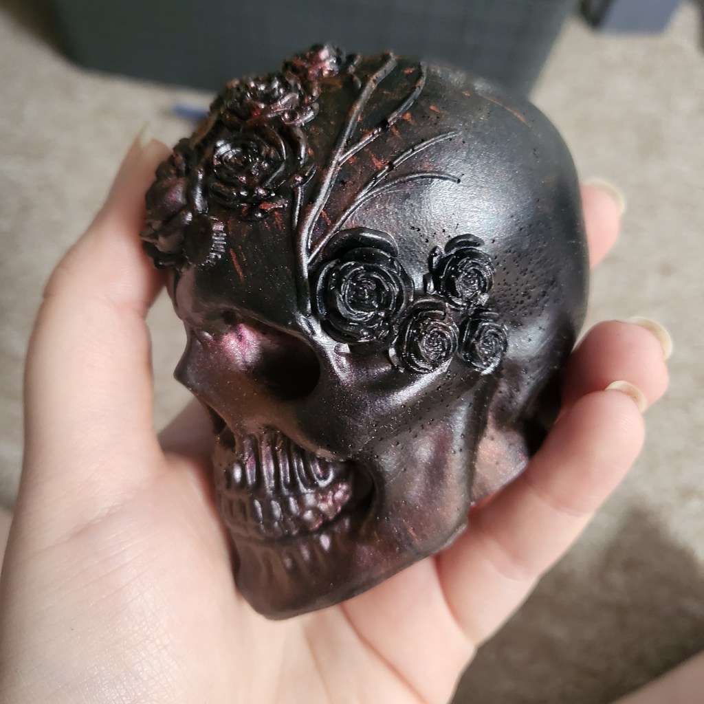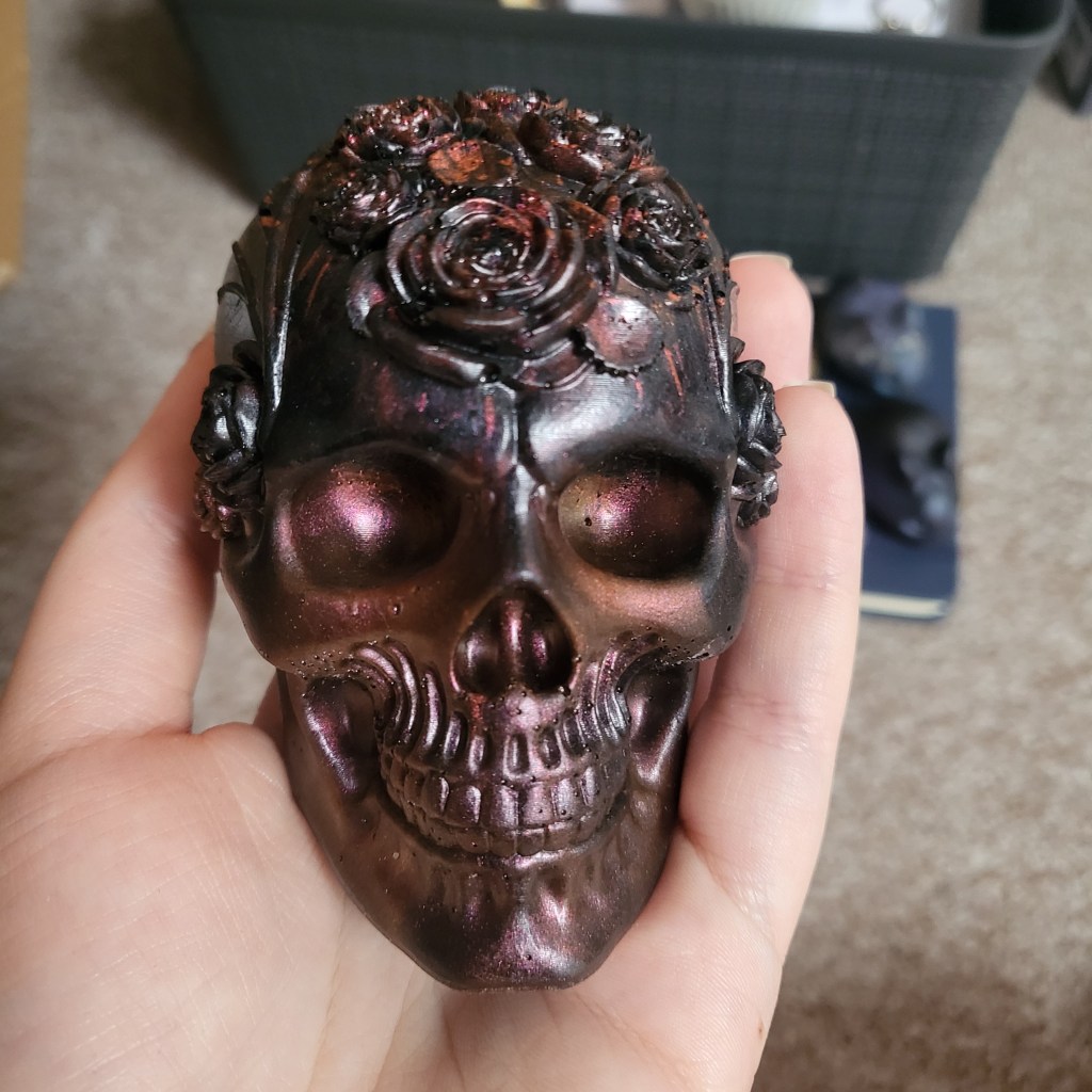 Anyway, this piece turned out quite well in the end. Well, well enough for me to be gifting it to someone else. For this piece, I did 2 dirty pours of resin coloured with black and red mica. Unfortunately, it ended quite bubbly in the bottom half of the skull and around the floral details. The colours in the bottom half also ended up being rather muddied. On top of that, I didn’t mix the red mica very well for the first pour and the mica ended up splattering on the top of the cranium. Even though this was yet another mistake, this is actually my favourite part of the piece.