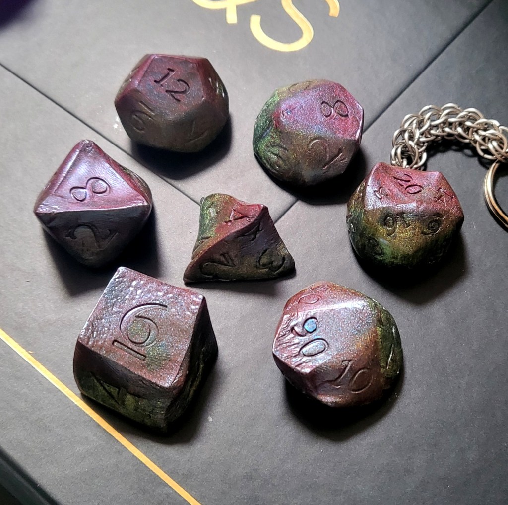 Oh, and for anyone curious, here is what the whole set ended up looking like. Please, enjoy my failure. I think that the D6 and D4 ended up being the most entertaining out of the lot.