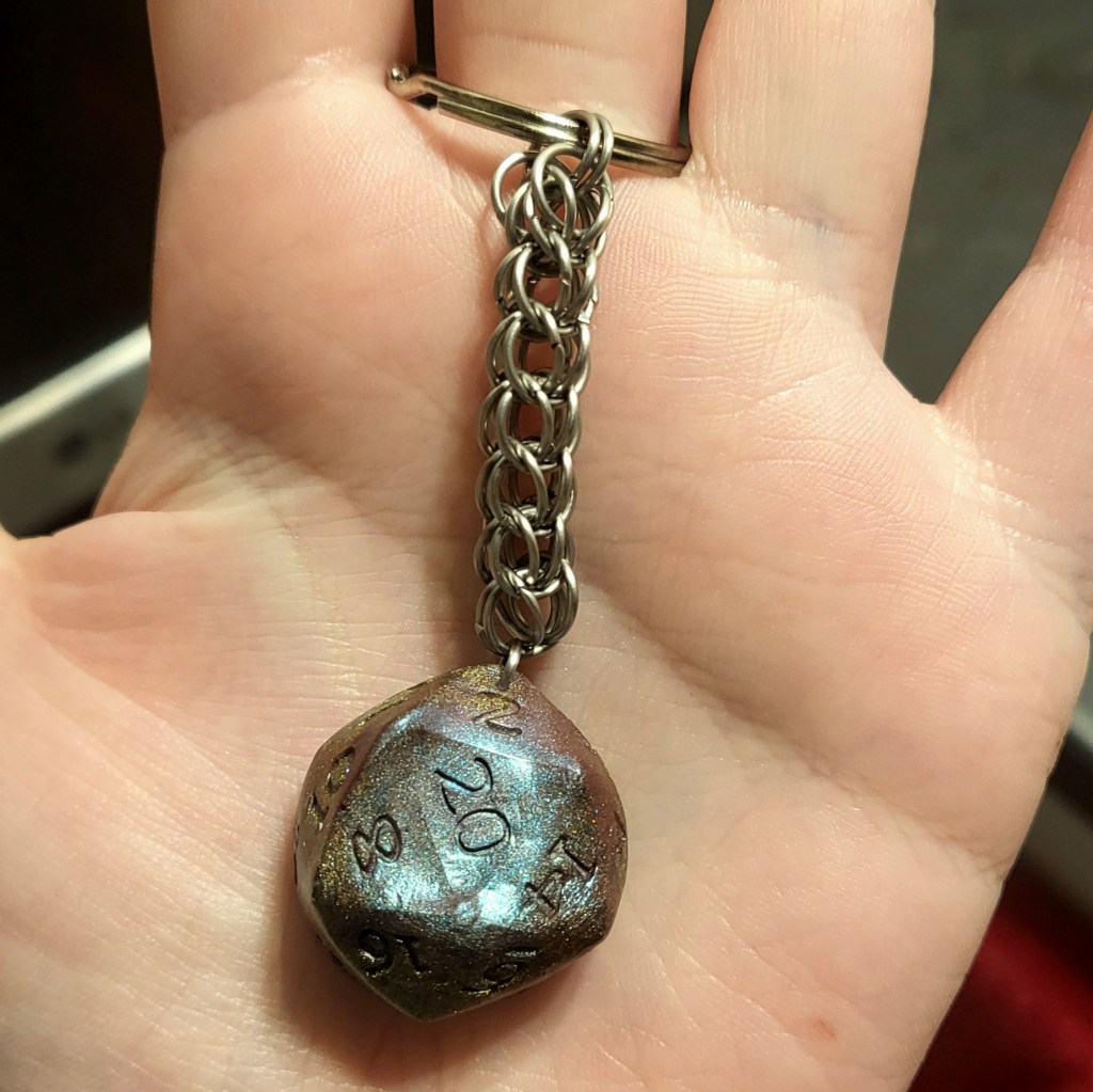 I was making my brother a dice set as a part of his Christmas present and fucked up (big time). What I had intended to do was to make a red and green dice set with white numbers. However, when I was mixing up the green resin, I think that I used too much mica. This resulted in dice that, after over 24 hours (the resin’s cure time), had not set properly. I didn’t quite realise how malleable they actually were until I started unmoulding everything and the first dice came out completely misshapen. I ended up unmoulding and trimming everything even though I know there was no hope of saving the set. I also did not have enough time to try and make another set. So, I had to improvise a little bit. I ended up putting the D20 on a keyring (on a small full Persian chain made from steel) and gifting that to my brother, with an apology attached saying that a dragon melted it.