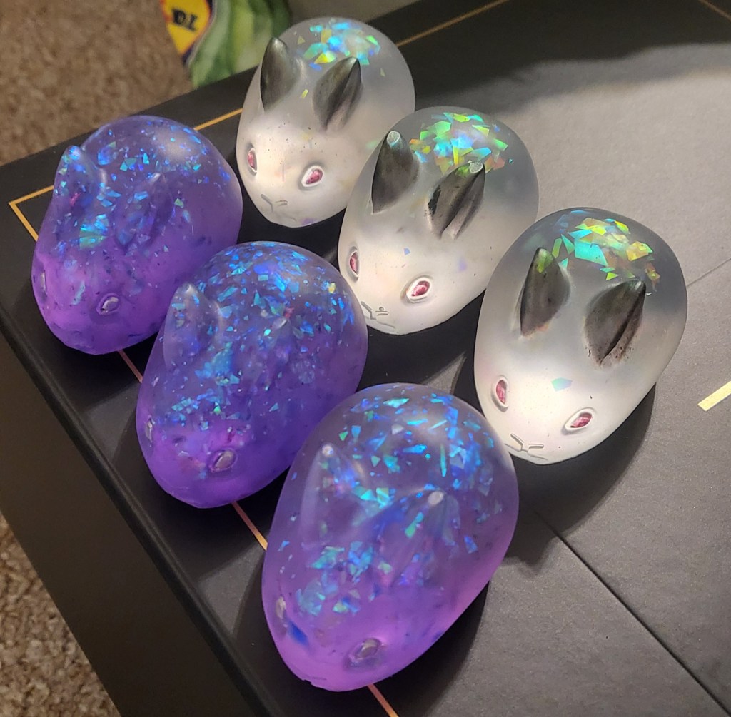 For one of the rabbits, I simply mixed in a bunch of blue/purple sparkly bits into some clear resin (like, so much that it was visibly clumpy), poured it into the rabbit moulds, and then coloured their eyes silver with a pen once set and unmoulded. For the other rabbits, I based them off of snow rabbits (yuki usagi, I think). I started off by mixing up some clear resin and adding some of my rainbow sparkle mix. I then used an eyeshadow applicator to coat the ears of the moulds with green mica. After that, I poured in the in the resin and, once set, unmoulded them and coloured their eyes in with a red metallic pen.