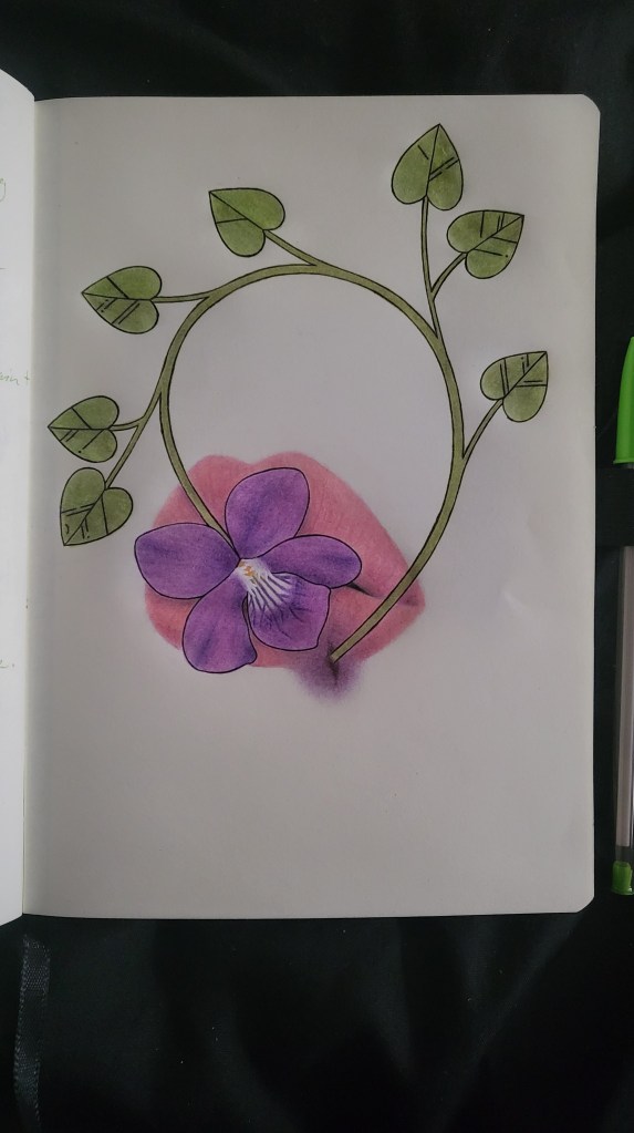 For this piece, I wanted to try and use a more realistic style and also try including a flower – in this case, a violet. This violet covers a pair of lips in order to represent the character’s silence through the majority of the song. The lips themselves are damaged to hint at the abuse the character suffers. The leaf shape used is also taken from the violet plant.