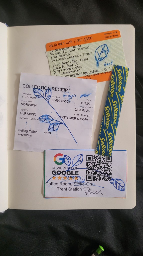 This one isn’t really that deep. I was one the train and decided to have a doodle on somethings that I had picked up on my journey. I first tested whether I how well I could draw on a train ticket (which I accidentally smudged). I had been thinking about the Magpie poem during the trip and decided to write that down on a collection receipt (which I also accidentally smudged). And, lastly, there was a screaming child on the train, hence the drawing on the Google review thing.
