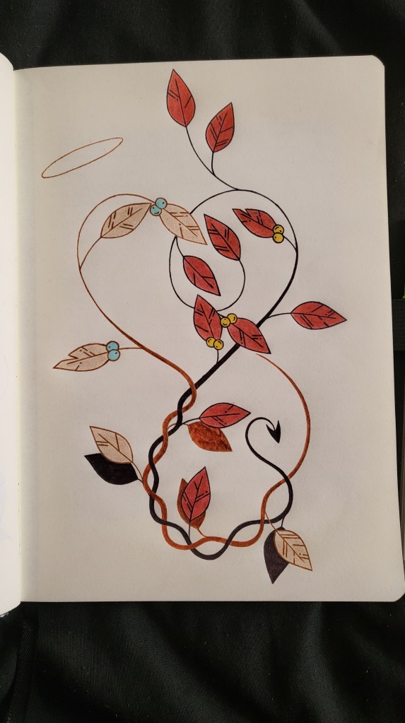 I also tried to get across some other character details aside from their general colour schemes. Crowley’s plant is sort of coiled and wiggly in order to shown off his more relaxed posture and his loose swagger when he walks. By comparison, Aziraphale’s plant in a lot more rigid and stiff to show off his regimented posture and style of walking. The berries on Aziraphale’s plant are also straight to help represent this, and also have the bonus quality of kind of looking like a bowtie (in my opinion, anyway). The berries on Crowley’s plant are lopsided to show of his almost constantly lopsided way of standing.