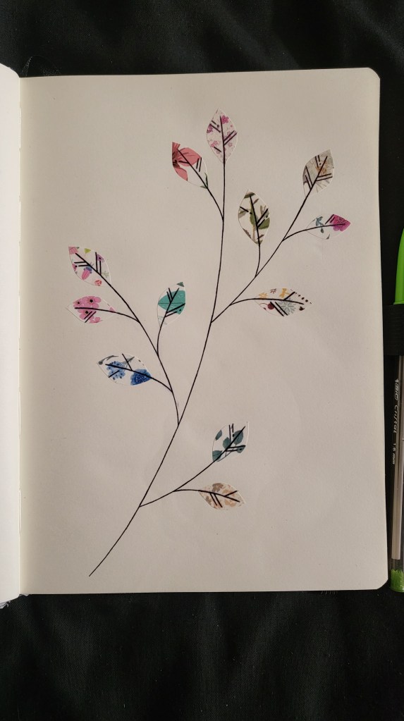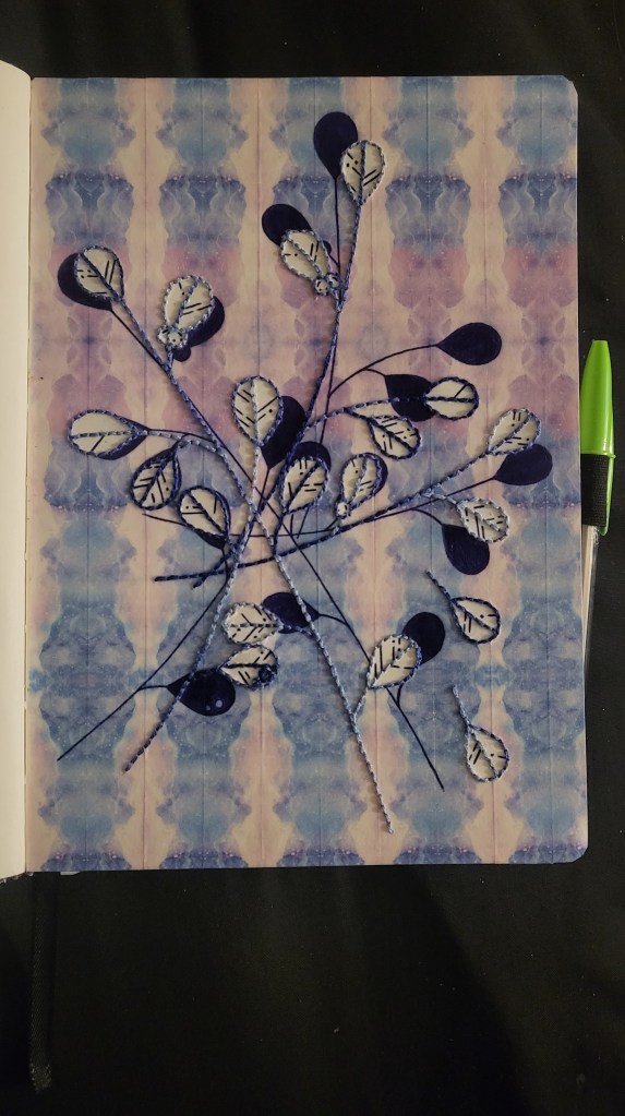 And, finally, the last piece of this post, and another one based on a song. It has a few different elements to it – A background made of washi tape, leaf lines and background plants drawn in dark blue biro, and foreground plants (sans leaf lines) backstitched in variegated blue thread. In order to achieve the latter, I reinforce the back of the page with some thick-ish sketchbook book paper. Otherwise, the page would have torn apart when trying to stitch in.