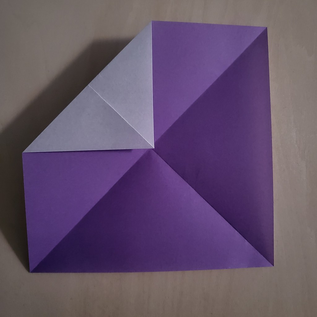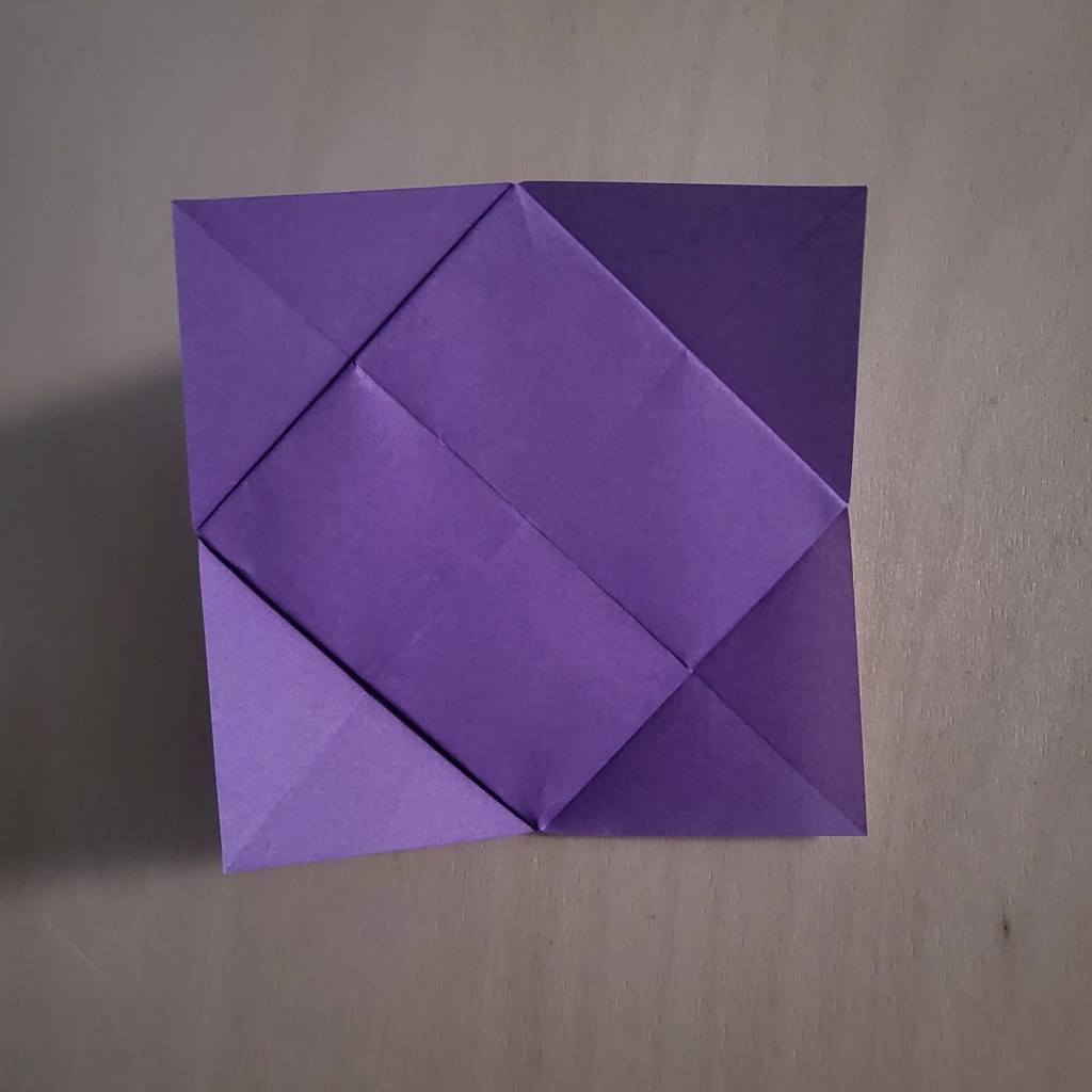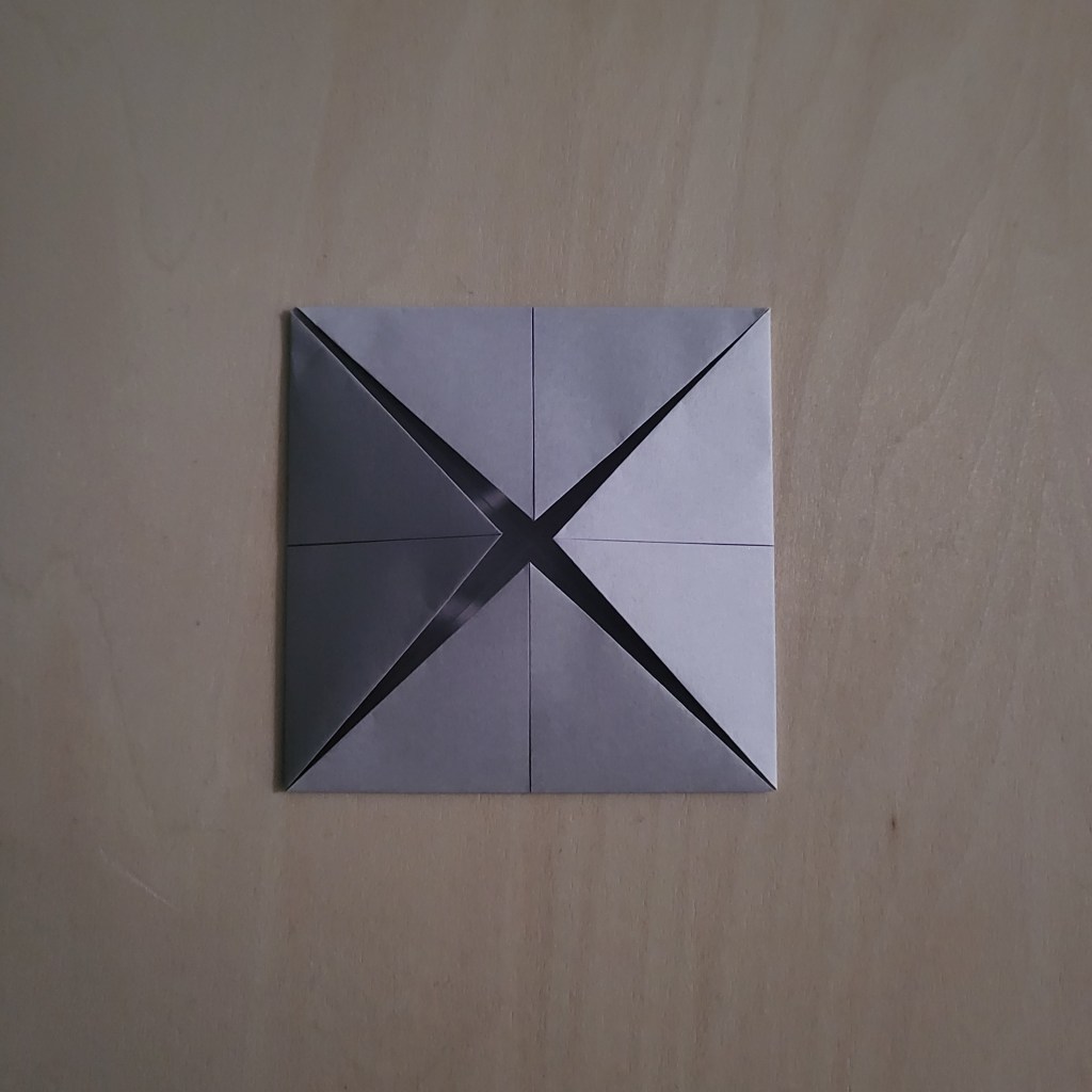 Fold the corners of your square in towards the centre, so that the corners all touch the middle of the ‘X’.