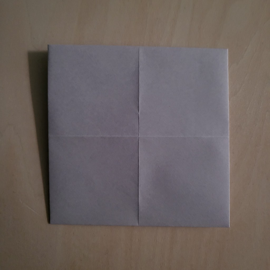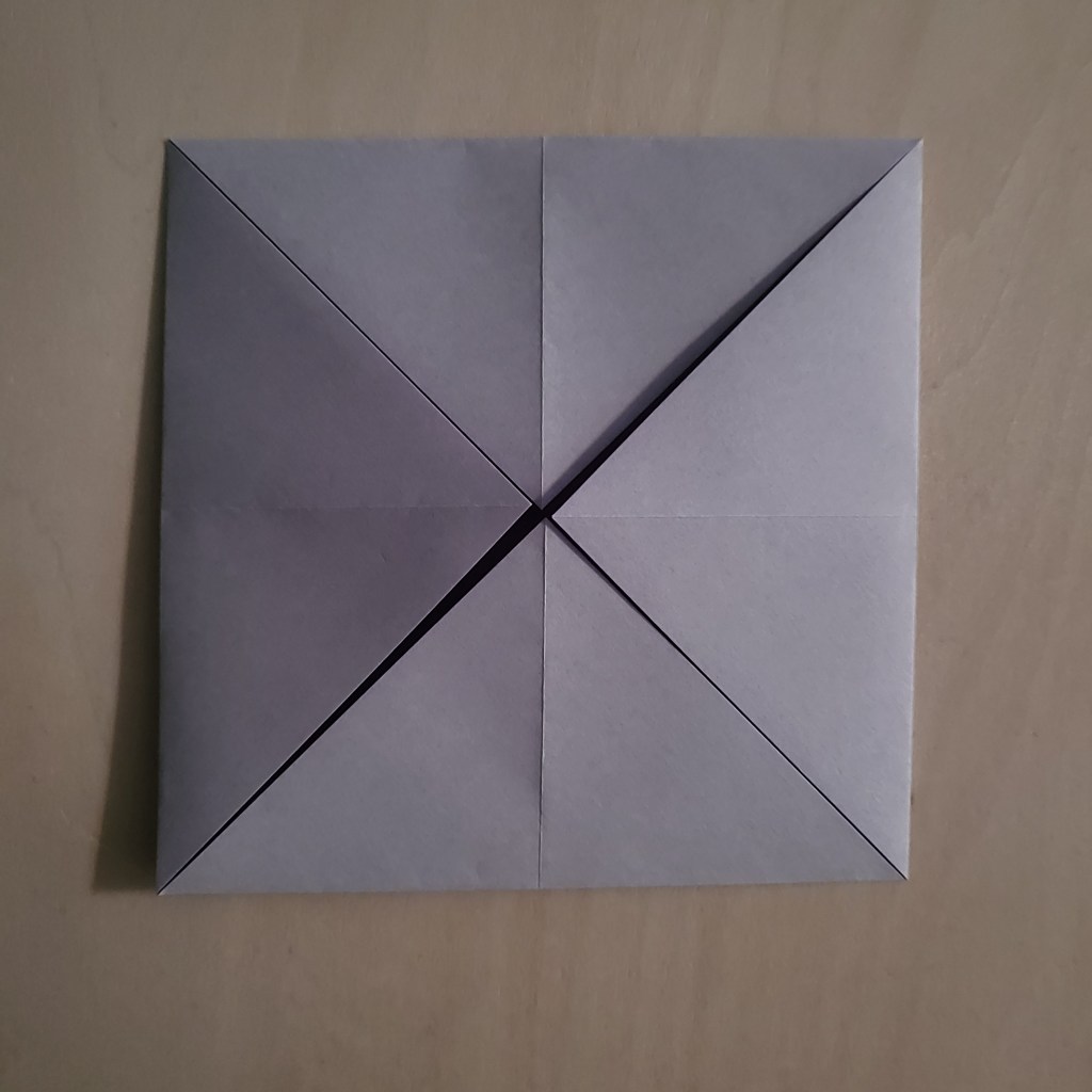 Fold your paper in half, from corner to corner, to make a triangle and then unfold it. Repeat this so that your 2 folds make an ‘X’ shape on you paper.