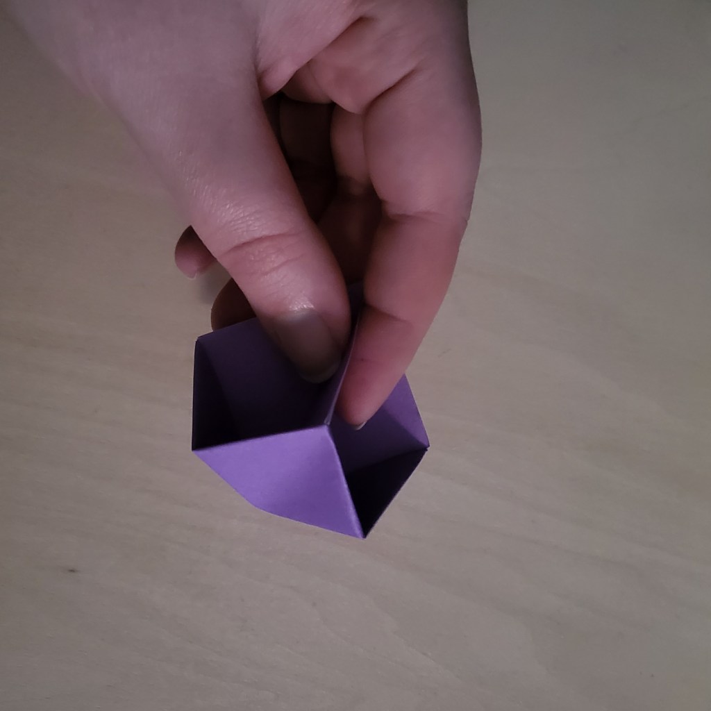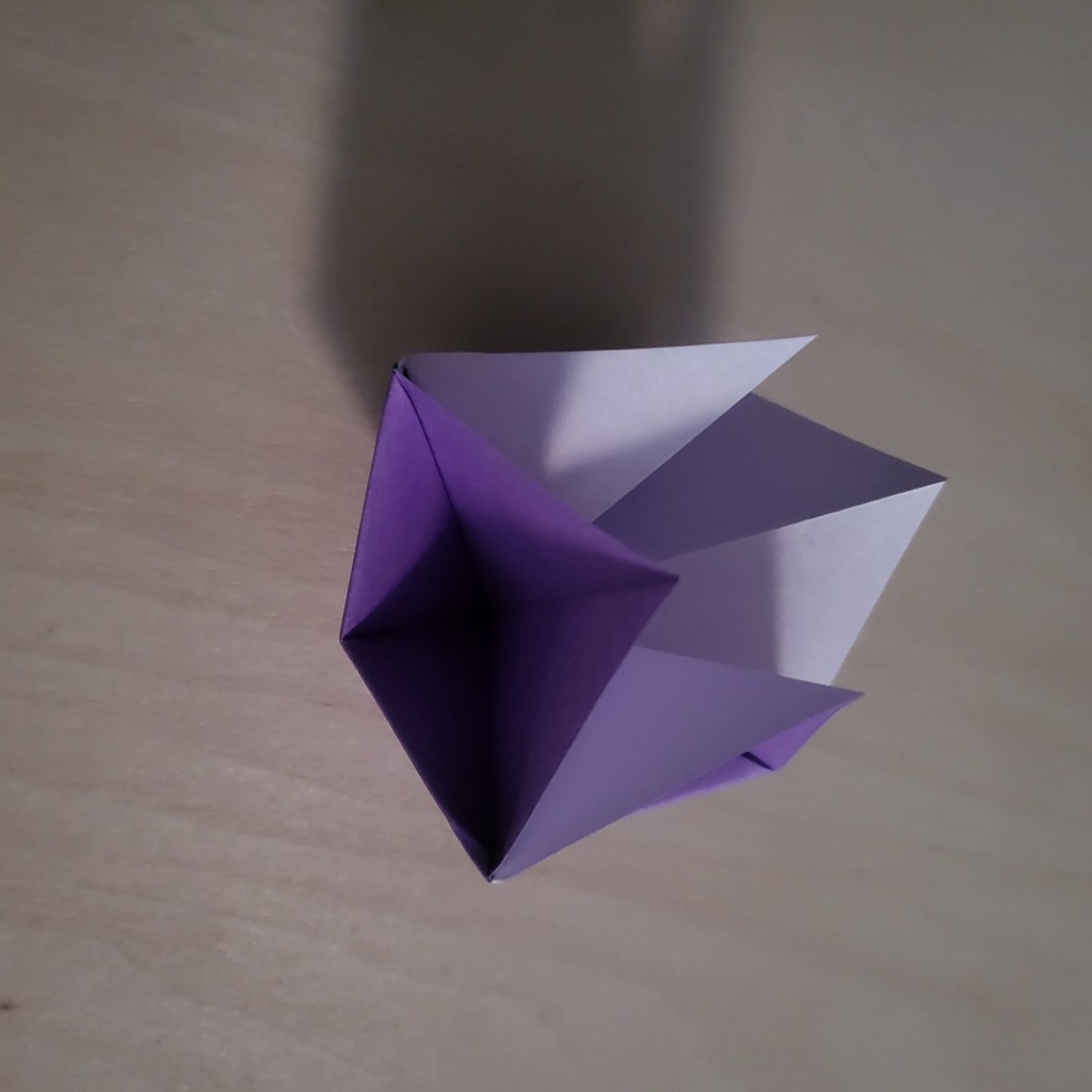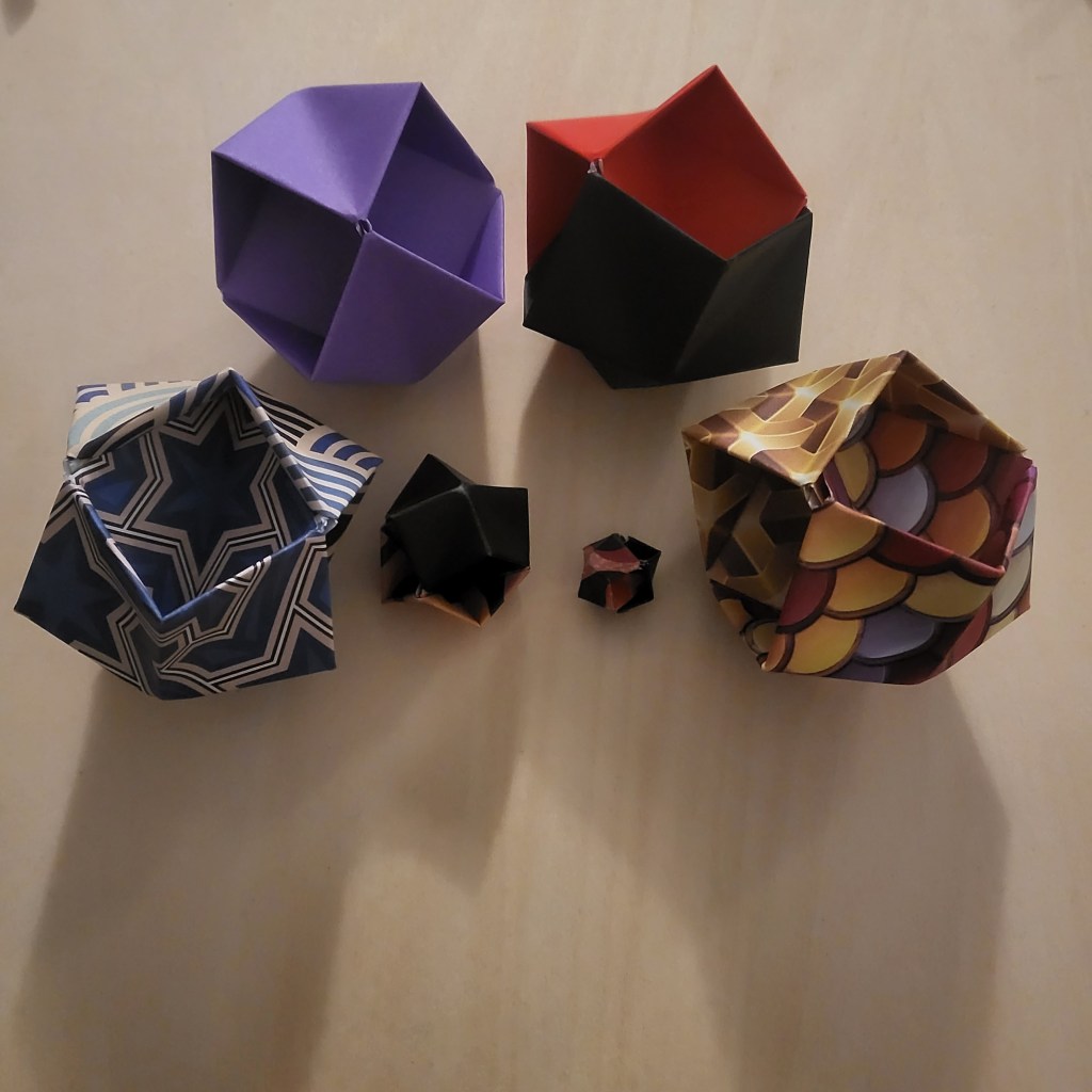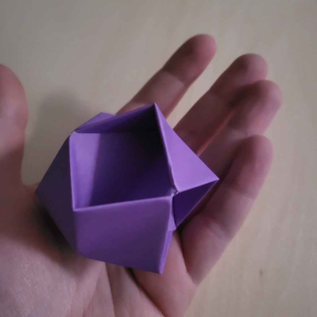 So, that’s why I’m here today. It’s a simple design (initially intended to be a bauble, I think) and works very well as a disposable cat toy. Seriously, I used to make these out of post-it notes for kittens to play with when I worked at the vets, and they loved them. This ball is light, batted with ease, and can picked up and carried (or thrown) by the mouth of a playful kitten. The reason I even tried to look it up again recently was because a colleague’s daughter recently acquired a kitten – I made him a couple of the balls (which he, apparently, loved and destroyed), and was trying to find the instructions so I could send them to my colleague and their daughter so they could make more themselves.