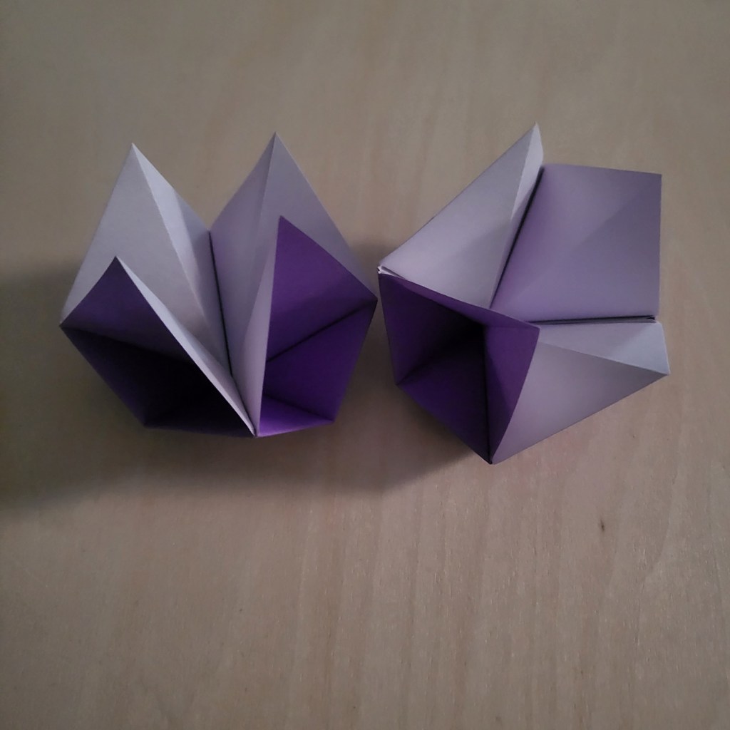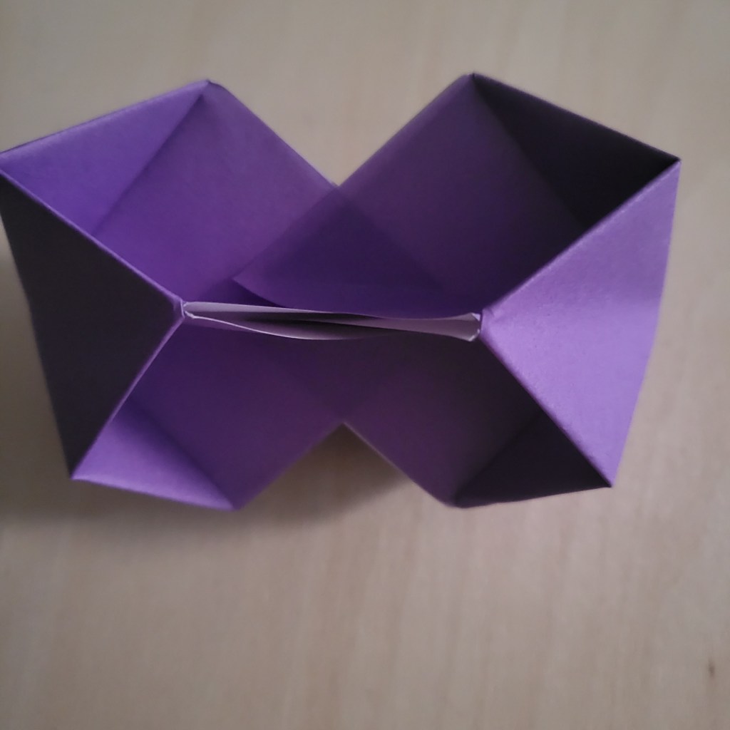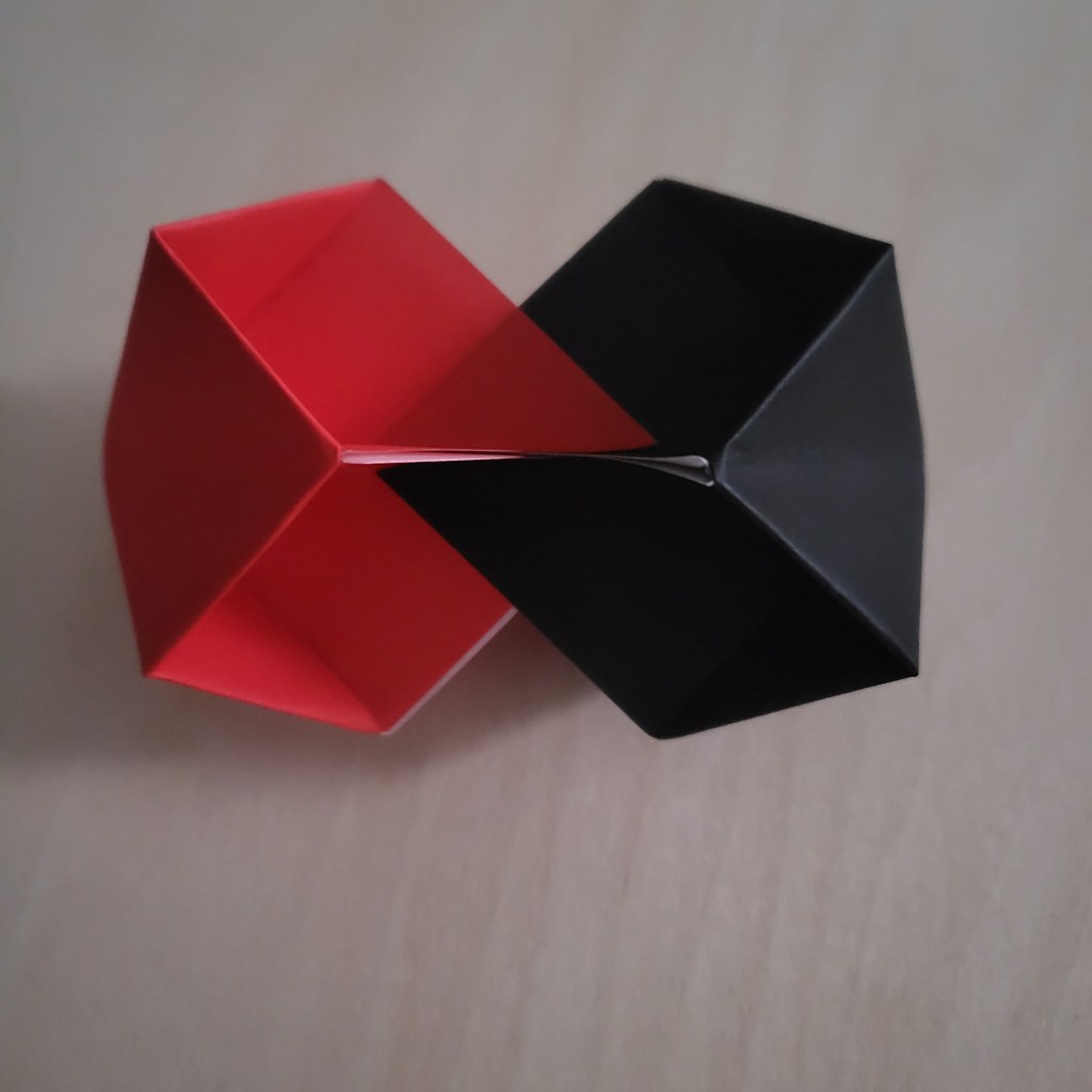 Now here comes the last (and trickiest) step. Slide the pieces together, making sure that you alternate which flaps are on top of each piece. This can be quite fiddly, but you can see this a bit better when using 2 different colours.